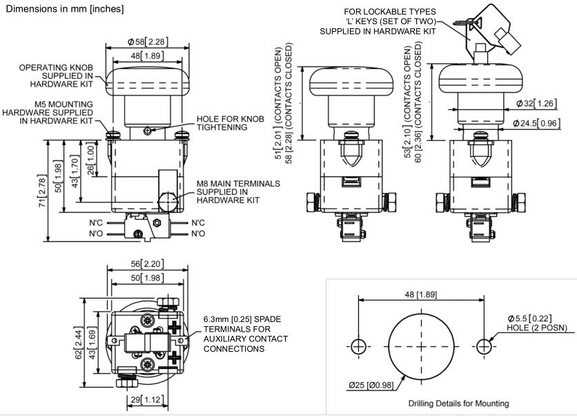 ED125是一种手动操作装置,具有偏心弹簧机构,可为主触点的打开和关闭提供快速动作。ED125易于安装(参见钻孔细节),并使用附带的M5 posidrive安装螺丝进行固定。可锁定的版本具有一个按钮,该按钮是将旋钮从“关”位置移动到“开”位置所必需的。一旦进入“开”位置,钥匙可以被移除。此后,旋钮可以被按下到“Off”位置,在该位置它将自动锁定并保持锁定直到钥匙再次被用于解锁。ED125可以使用正品的替换零件。